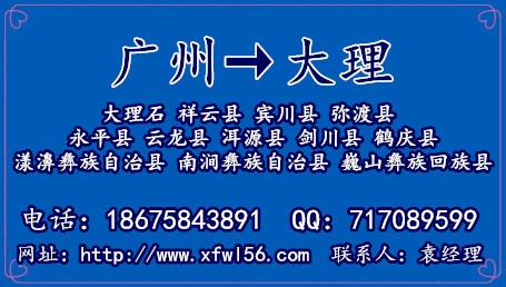 廣州到云南大理市物流廣州鑫富物流有限公司,電話:020-87461290 ,手機:18675843891 ,QQ:717089599 聯系人:袁經理,為廣大新老客戶提供優質廣州到云南大理市物流專線及配送服務,歡迎來電咨詢,鑫富物流公司在珠三角的深圳、佛山、珠海、東莞、中山、惠州、江門、肇慶都可以上門提貨,貨到云南大理市可以送貨到各鄉鎮及偏遠地區,讓客戶方便收貨,鑫富國家AAA物流企業–貨運一站式解決方案。